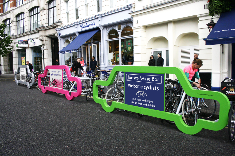 כל יחידה מותאמת למקום חניית רכב סטנדרטית, ונושאת את המסר שאופניים יותר חסכוניים בניצול השטח – ממכוניות.
