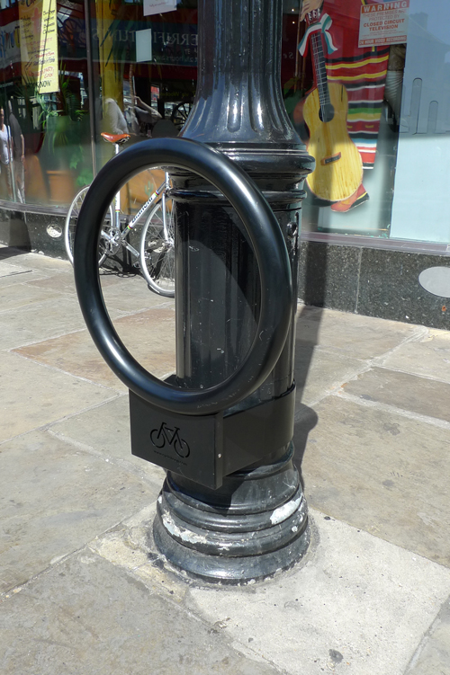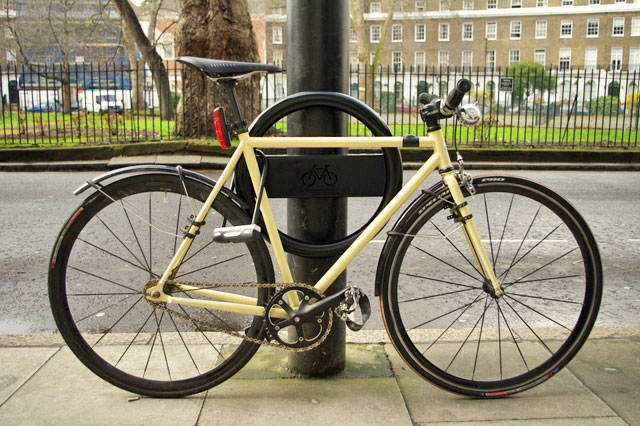 רוכבי אופניים יכולים לנעול את האופניים שלהם באמצעות מנעול U במקום שרשרת